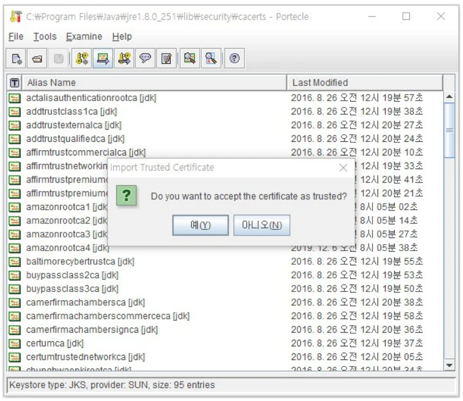 그러나 자바의 경우엔 시스템에 설치된 인증서가 아닌 자체 인증서 저장소를 가지고 있어서 자바의 Keystore 에 추가하는 작업을 해 주어야 한다.