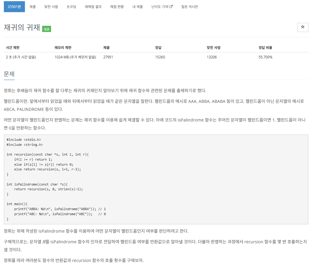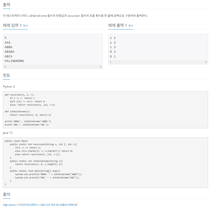 문제 분석 : 펠린드롬 함수의 반환값과 재귀 함수의 호출 횟수를 구한다.