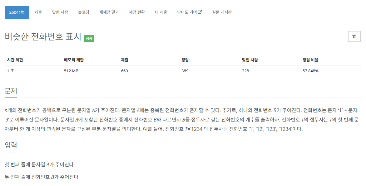 - A에 포함된 전화번호 중 B와 같지 않으면서 B를 접두사로 갖는 전화번호의 개수를 출력해야한다.