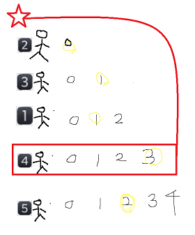 예제대로 5명이 한줄로 선 상태를 그림으로 그려보면, 아래와 같다.