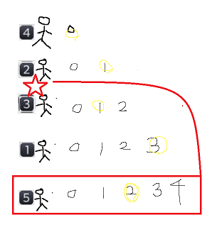 즉 1번 학생은 0을 뽑고, 2번학생은 1을 뽑고, 3번학생은 1을 뽑고, 4번 학생은 4을 뽑고 , 5번 학생은 2 를 뽑은 상황을 가정해보면