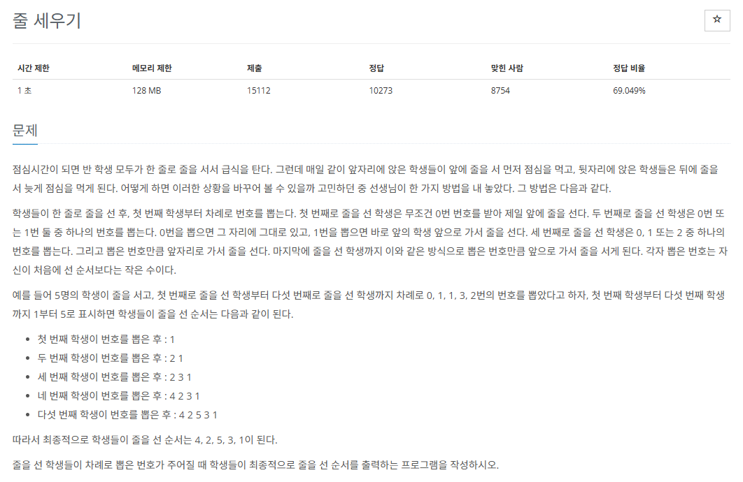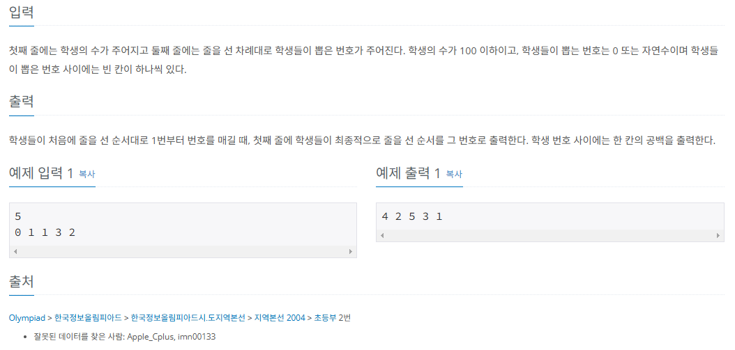 - 줄을 선 학생들이 차례로 뽑은 번호가 주어질 때 학생들이 최종적으로 줄을 선 순서를 출력