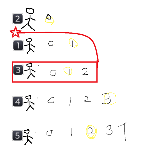 5번째 학생이 2번을 뽑은 후에, 2명 앞으로 이동해서